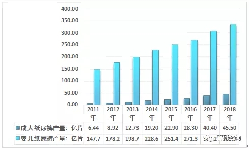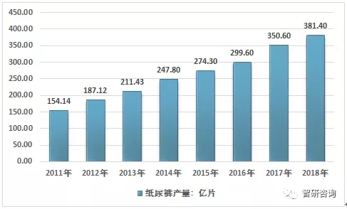 2011-2018年我國(guó)紙尿褲產(chǎn)量統(tǒng)計(jì)圖