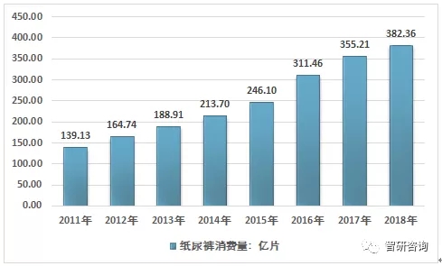 2011-2018年我國(guó)紙尿褲消費(fèi)量統(tǒng)計(jì)圖