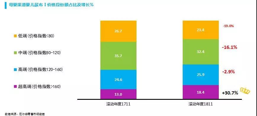 以嬰兒洗護(hù)領(lǐng)域?yàn)槔?018年高端和中高端產(chǎn)品可占到全渠道近50%的比重,產(chǎn)品顏值化、消費(fèi)輕奢華、品牌國際化成為趨勢,如高端品牌艾惟諾2018年線上增幅高達(dá)116%,可見一斑。