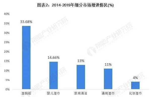 隨著我國人民個(gè)人衛(wèi)生意識的不斷提高,人們對濕巾的需求越來越大,對濕巾品類和原料的要求也越來越高。因此濕巾品類不斷豐富,出現(xiàn)更多具有較強(qiáng)針對性的產(chǎn)品,比如濕廁紙、嬰兒用紙、廚房濕巾、卸妝濕巾等。目前我國市場中嬰兒濕巾仍占據(jù)主要市場份額,但濕廁紙?jiān)鏊傺该?,高達(dá)33.68%,有望趕超嬰兒濕巾。