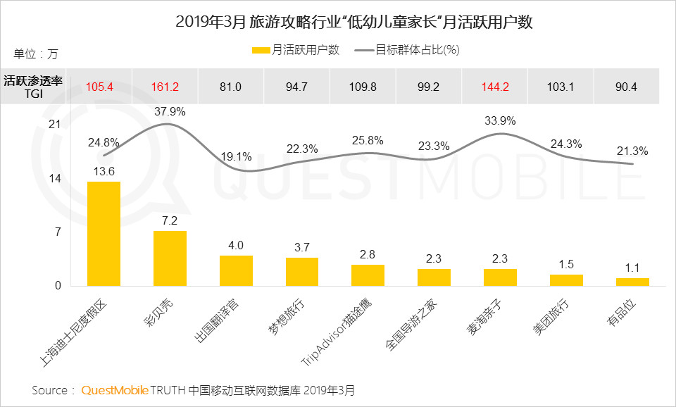 在親子旅游方面,隨著親子節(jié)目的熱播,讓近兩年親子游市場持續(xù)火爆。在旅游攻略APP中,彩貝殼目標群體占比37.9%,其次為麥淘親子33.9%,而麥淘親子、上海迪士尼、彩貝殼等親子游類的旅游攻略受到低幼家長的青睞。從中可以看到隨著對教育要求的全面升級,孩子的眼界和經(jīng)歷、親子陪伴也成為了父母關注的一大重點。