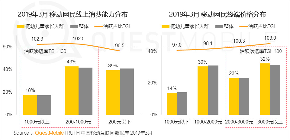 2019年3月移動網(wǎng)民線上消費能力數(shù)據(jù)顯示,200-1000元線上消費占比43%,1000元以上18%,200元以下39%。但網(wǎng)民終端價格3000元以上占32%,2000-3000元占23%。從中可以看到“低幼兒童家長”人群線上消費能力顯著高于整體網(wǎng)民,且使用高價格終端的比例較高,未來兒童消費將成為經(jīng)濟市場一大增長點。