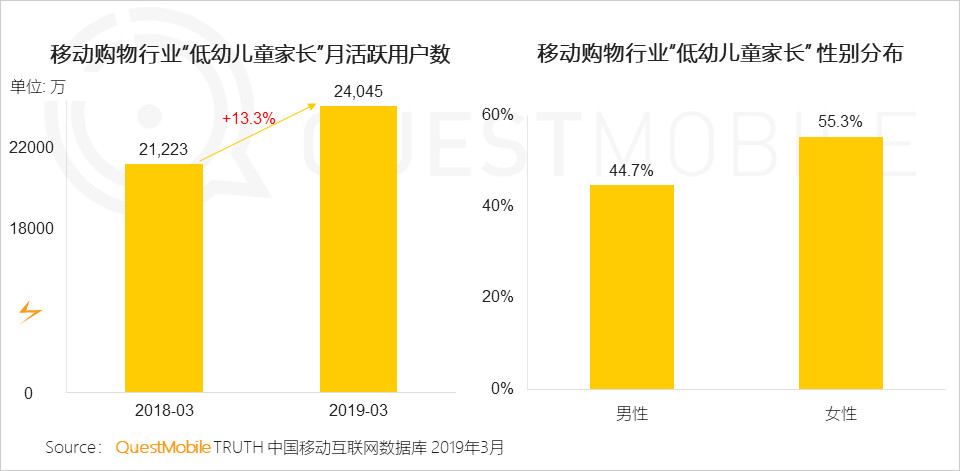 在線消費領域,2019年3月網(wǎng)購的“低幼兒童家長”人群同比增長13.3%;其中移動購物行業(yè)”低幼兒童家長“性別分布上來看,男性占44.7%,女性占到55.3%。可見得“寶媽”者得市場,女性的占比顯著高于男性。