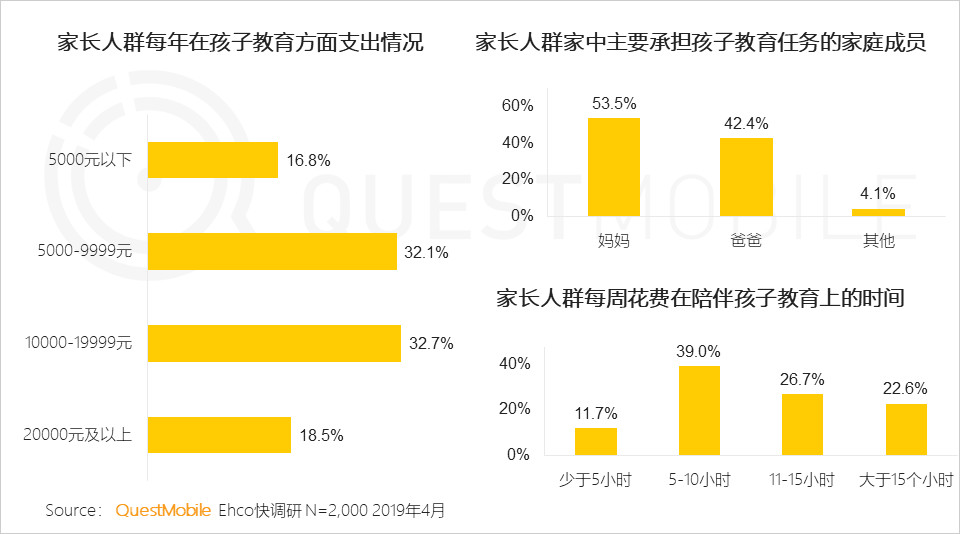 而在家庭人群每年在孩子教育方面支出情況,超八成的家長每年在孩子的教育方面支出均在5000元以上,其中10000-19999元占32.7%,5000-9999元占32.1%??梢娙藗儗τ诤⒆拥慕逃砷L真是寄予厚望。而在家長人群中媽媽作為主要承擔孩子教育任務占53.5%。從中可以看到在孩子的教育問題上,“媽媽”才是教育決策的主要決策者。而在家長人群每周花費在陪伴孩子教育上的時間5-10小時占比最高,達到39%。