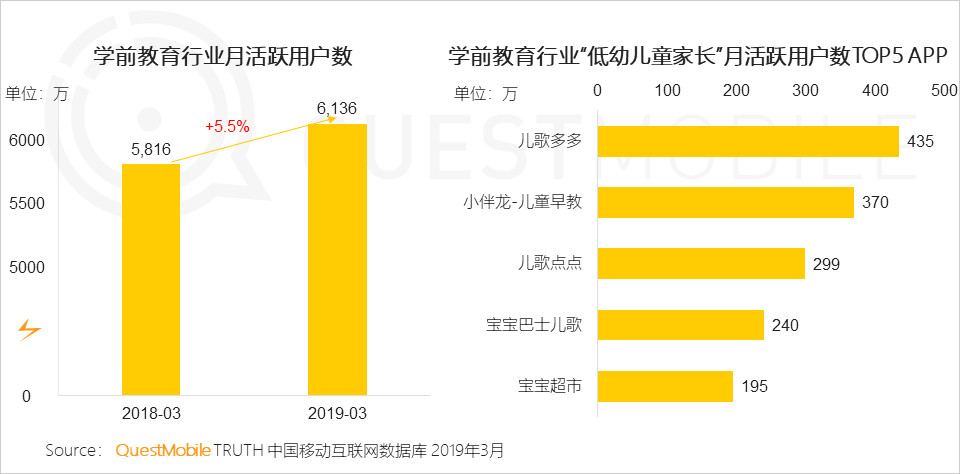最新數(shù)據(jù)顯示,學前教育用戶增速明顯高于整體移動網(wǎng)民增長速度,而在線早教憑借技術的快速發(fā)展深得家長喜愛,在學前教育行業(yè)”低幼兒童家長“月活躍用戶數(shù)TOP5APP排列依次分別是兒歌多多、小伴龍-兒童早教、兒歌點點、寶寶巴士兒歌、寶寶超市。其中早教APP兒歌多多以435萬排列第一,其次為小伴龍-兒童早教月活躍用戶達370萬。