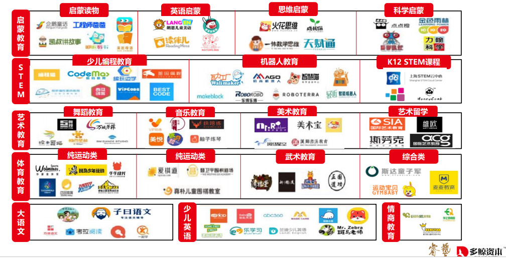 從素質(zhì)教育細分賽道典型公司來看,產(chǎn)品類型覆蓋啟蒙教育、藝術教育、早幼教平臺、少兒編程教育、情商教育等。