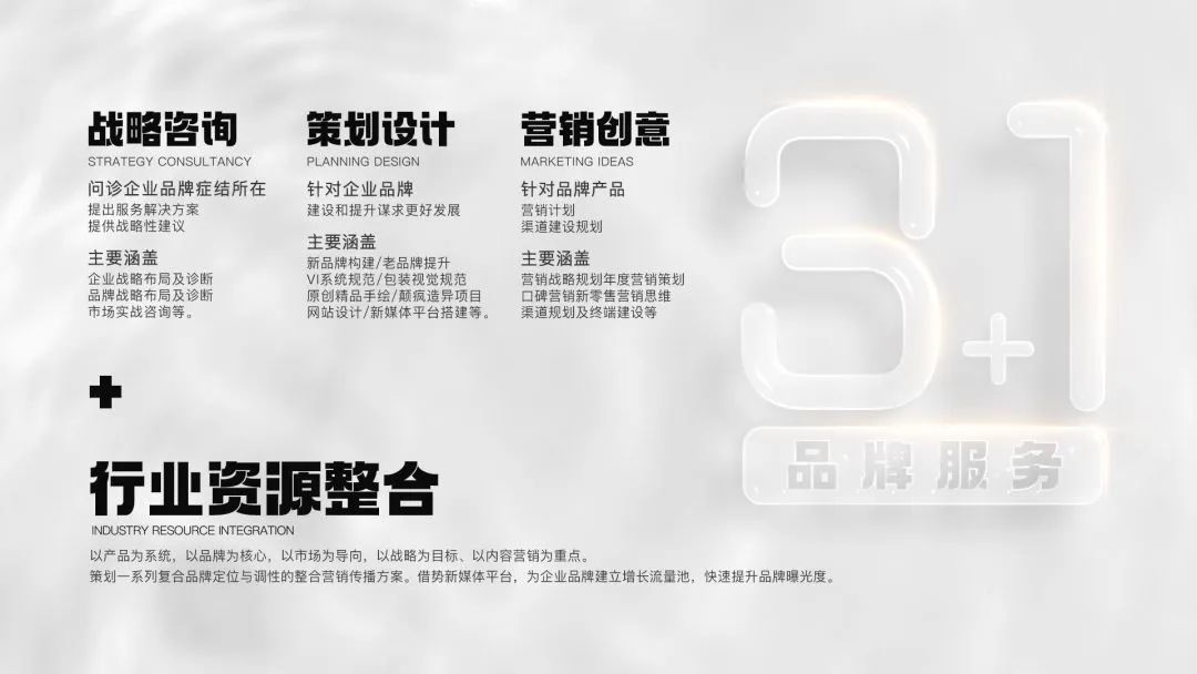 在一方品牌營銷管理堅持以品牌思維引領(lǐng)生活快消品行業(yè),致力于讓每個品牌更有價值,讓每個項目落到實處。“3+1品牌服務(wù)理念”精心打造戰(zhàn)略咨詢、策劃設(shè)計及營銷創(chuàng)意三大核心板塊,加之整合行業(yè)產(chǎn)業(yè)鏈,以提供定制型全案服務(wù),驅(qū)動品牌的市場價值,締造行業(yè)第一綜合型服務(wù)品牌!