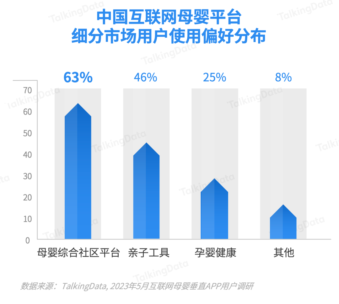 使用母嬰綜合社區(qū)的母嬰平臺用戶占比更高,達到63%,這表明用戶更偏愛涵蓋工具+社區(qū)等復(fù)合型垂直平臺。