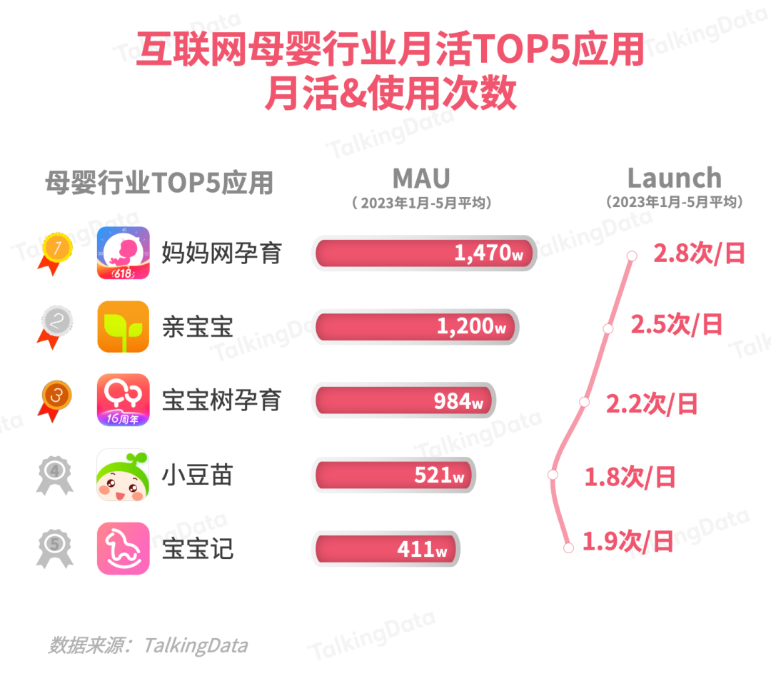 在行業(yè)Top 5平臺的2023年1-5月月活趨勢上,媽媽網(wǎng)孕育、親寶寶、寶寶樹孕育均表現(xiàn)出不同程度的增速??赡艿靡嬗谄淠笅胗脩羧后w的忠誠度和能提供有價值的版塊/內(nèi)容,媽媽網(wǎng)孕育體現(xiàn)出更為顯著的優(yōu)勢。