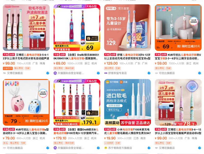 而除此之外,在性能方面差異性不大。從淘寶平臺(tái)中可見(jiàn),各大品牌的外觀和賣(mài)點(diǎn)都十分相似,如“軟毛”“超聲波”“小刷頭”“卡通外觀設(shè)計(jì)”“高效清潔”。