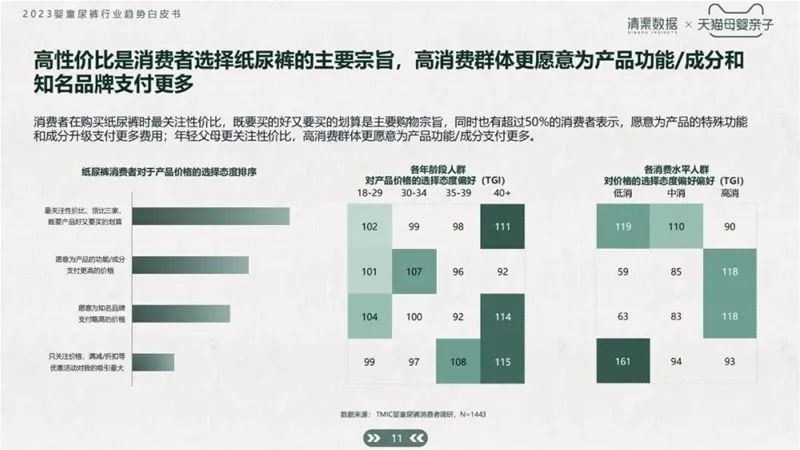 根據(jù)白皮書數(shù)據(jù)顯示,消費(fèi)者在購買紙尿褲時(shí)最關(guān)注性價(jià)比,“又好又劃算”是主要購物宗旨,同時(shí)也有超過50%的消費(fèi)者表示,愿意為產(chǎn)品的特殊功能和成分升級(jí)支付更多費(fèi)用:年輕父母更關(guān)注性價(jià)比,高消費(fèi)群體更愿意為產(chǎn)品功能/成分支付更多。