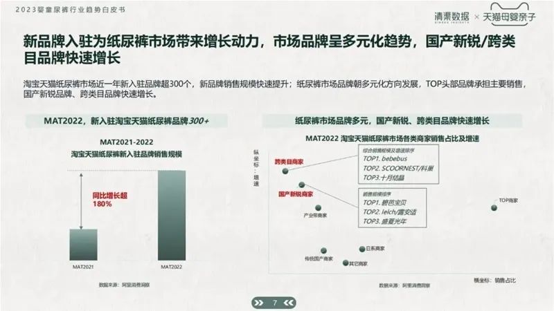 根據(jù)白皮書數(shù)據(jù)統(tǒng)計(jì),近兩年淘系紙尿褲市場新入駐品牌超300個(gè)。新品牌銷售規(guī)模快速提升,市場品牌呈多元化趨勢,國產(chǎn)新銳以及跨類目品牌也在快速增長。同時(shí),bebebus、十月結(jié)晶、科巢等品牌先繼進(jìn)入紙尿褲市場,給市場帶來源源不斷的活力。