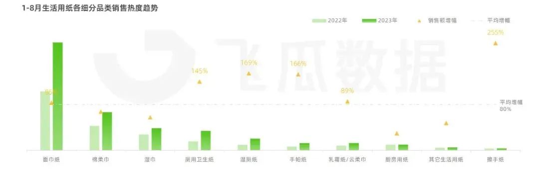 在各大電商平臺中,抖音電商表現(xiàn)出強勁增勢,2023上半年生活用紙的品類銷售熱度較去年同期增長75.4%。