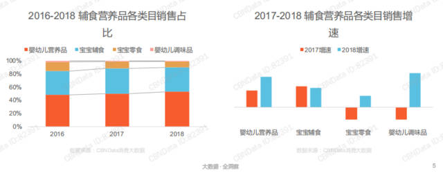 目前輔食營養(yǎng)品大致分為嬰幼兒營養(yǎng)品、寶寶輔食、寶寶零食、嬰幼兒調(diào)味品四個(gè)子品類。從上圖我們不難看出,從2016年—2018年嬰幼兒營養(yǎng)品從不足50%提升至50%以上,銷售占比逐年提升,發(fā)展態(tài)勢一片大好。一方面,“生命早期1000天營養(yǎng)健康”在政府層面的確立,更是為嬰兒營養(yǎng)品打開了市場的大門;另一方面,在優(yōu)生優(yōu)育觀念的影響下,孕育下一代成為每個(gè)家庭的頭等大事,嬰幼兒營養(yǎng)品的市場占比與熱度日益提升。