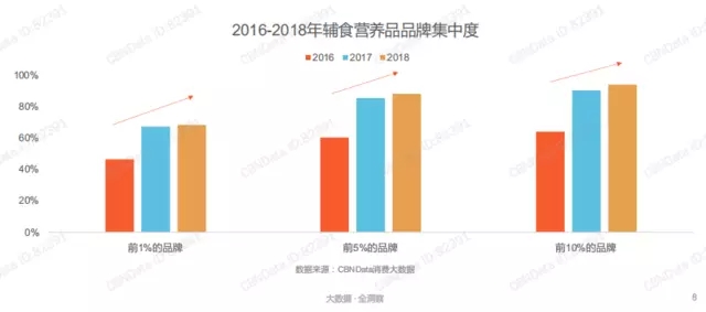 一直以來,嬰幼兒輔食營養(yǎng)品行業(yè)市場集中度都較高,頭部效應(yīng)比較凸顯。從上圖可以看出,2016年輔食營養(yǎng)品前1%的品牌銷售額占比低于半數(shù),發(fā)展至2017-2018年,輔食營養(yǎng)品前1%的品牌貢獻(xiàn)了超過6成以上的銷售額,前5%的品牌貢獻(xiàn)了八成左右的銷售額,前10%的品牌貢獻(xiàn)了接近90%的銷售額,且在逐年增強(qiáng)。品牌集中度持續(xù)趨高,頭部企業(yè)地位難以撼動。