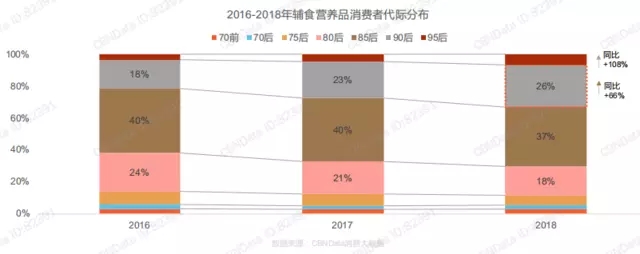 隨著90后新生代媽媽的不斷增多,母嬰人群的認(rèn)知水平及消費(fèi)水平大幅提升,她們更愛愿意為“健康”的生活態(tài)度付費(fèi)。從上圖可以看出,近三年來,85后仍為輔食營養(yǎng)品的主要購買人群,人數(shù)占比為40%左右,在所有人群中最為強(qiáng)勢;而90/95后作為新生代母嬰消費(fèi)人群異軍突起,消費(fèi)者人數(shù)大幅增長,人數(shù)占比從2016年18%提升至30%以上,其中,90后成為一股新興力量,2018年較2017年增長66%,有望成為嬰幼兒營養(yǎng)品的下一個(gè)主力人群。